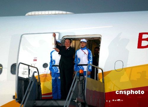 4月5日晚7时25分,载有北京奥运祥云圣火的“奥运圣火号”飞抵英国首都伦敦。伦敦人对圣火的到来极为重视,奥运事务大臣等重要官员悉数抵达机场迎接。图为北京奥组委执行副主席蒋效愚(中)手提圣火灯走下飞机。 中新社发 沈晨 摄