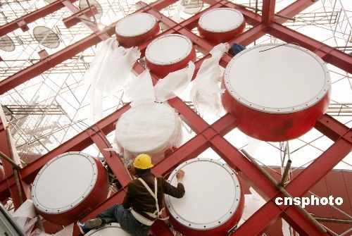 4月5日,北京奥林匹克中心区下沉花园,施工人员正在加紧往桔红色框架上安装大鼓,迎接2008北京奥运会。据悉,这些大鼓的直径在1米至两米左右, 届时,数百个大鼓将组成一道富有中国特色的靓丽风景。中新社发 吴芒子 摄