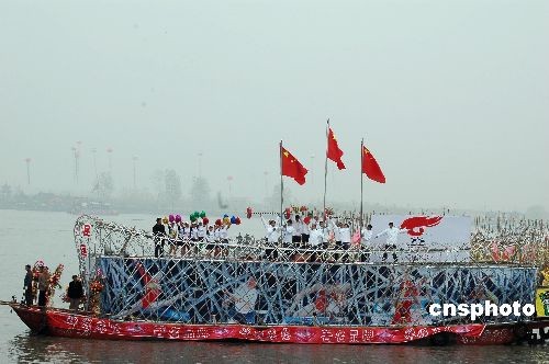 图:江苏姜堰“鸟巢”贡船水上迎奥运(2)