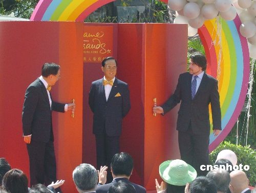 四月七日,香港旅游发展局在山顶露天广场正式启动为期两个月的“全新体验 就在山顶”推广计划,并举行香港特区行政长官曾荫权蜡像进驻杜莎夫人蜡像馆仪式,曾荫权(左)与香港杜莎夫人蜡像馆总经理白沛然(右)出席揭幕仪式。中新社发 邓庆乐 摄