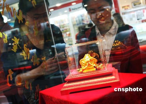 4月7日,由北京奥组委授权发行的“北京奥运徽宝黄金珍藏版”在北京王府井热销。“北京奥运徽宝黄金珍藏版”全球限量发行5000方,每方售价为人民币18.8万元,其主体是以500克千足金为质材的印章,由精雕细琢的硬木漆红嵌银丝宝盒包藏。 郑雄增 摄