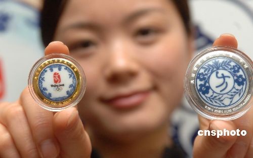 2008年4月8日,由第29届奥林匹克运动会组织委员会特别授权的“奥运青花瓷金银纪念章”在北京上市。图为发行人员展示“奥运青花瓷金银纪念章”。此全套金银纪念章共包括3款金质青花瓷徽章(左)和35款银质青花瓷徽章(右)。纪念章的正面,是明净素雅的(剪纸造型)青花瓷,背面各为金银质地。作者: 邹宪