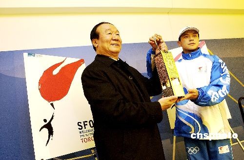 图为北京奥组委执行副主席蒋效愚和圣火护卫员共举圣火灯。作者: 陈钢