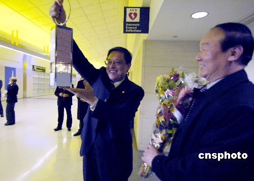 中国驻美大使周文重(左)从北京奥组委执行副主席蒋效愚(右)手中接过奥运圣火灯后高高举起。作者: 陈钢