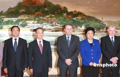 四月九日,中国国务院总理温家宝在北京人民大会堂会见国际奥委会主席罗格(左三),国务委员刘延东(右二)、北京奥组委主席刘淇(左一)等参加了会见。中新社发 廖文静 摄