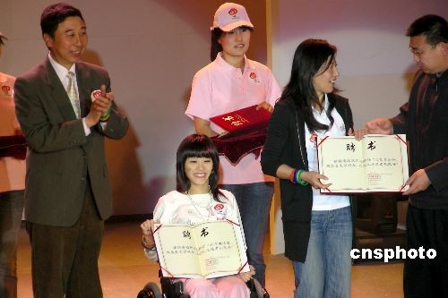 四月十日,中国首枚冬奥会金牌获得者扬扬、前体操运动员桑兰和中国相声名家冯巩被聘为北京奥运会、残奥会文明观众、拉拉队队长。图右为杨扬从北京奥组委志愿者部部长刘剑手中接过聘书。作者: 沈嘉