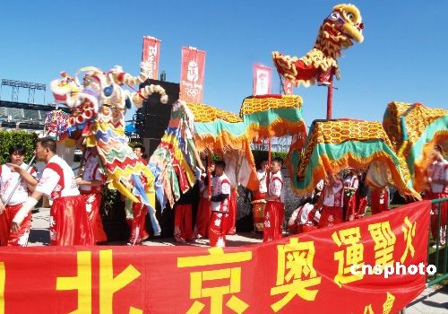 图:华人华侨舞狮舞龙庆祝奥运圣火传递