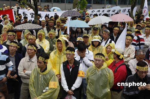 4月10日,台湾营造工会动员数千人在台北中油大厦楼前集会,抗议当局未信守承诺,给予营造业应有的补贴。该工会还宣布全台停工一天。中新社发 杜洋 摄