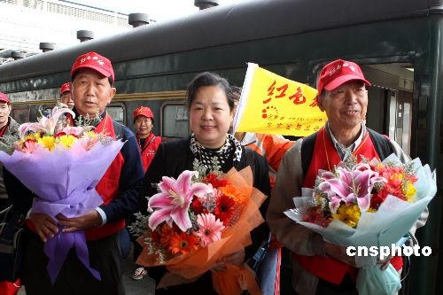 4月10日,2008年首列红色旅游专列从广东梅州市抵达天津,1000多名由退休老人组成的旅行团将走访天津及北京主要红色旅游景点,同时标志着“纪念三大战役胜利60周年系列主题活动”正式启动。中新社发 赵隽 摄