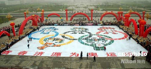 4月12日,愚公家乡河南省济源市千名小学生在济源世纪广场2008平方米的画布上共同绘制巨型福娃,表达济源市青少年学生对北京奥运会的向往和美好祝愿。中新社发 平白 摄