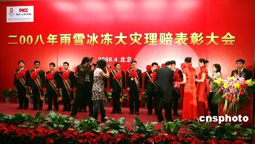 中国人民财产保险股份有限公司(PICC)在北京举行2008年雨雪冰冻大灾理赔表彰大会,对该公司在此次大灾理赔工作中取得突出成绩的单位(集体)和个人进行表彰。中新社发 杨可佳 摄
