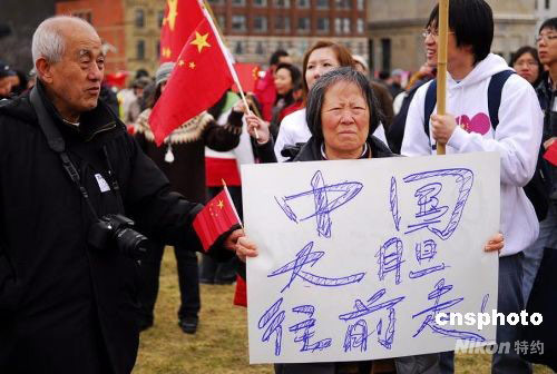 当地时间2008年4月13日下午,来自加拿大各地的近万名华人聚集在首都渥太华国会山广场,举行“宣传西藏真相、维护祖国统一”大型集会活动。集会全程充满“和平、友爱”的热烈气氛,组织者宣读了中英文集会声明和致加拿大总理哈珀公开信,表达海外华人“支持一个中国、支持北京奥运会,反对暴力”的心愿。中新社发 杨硕 摄