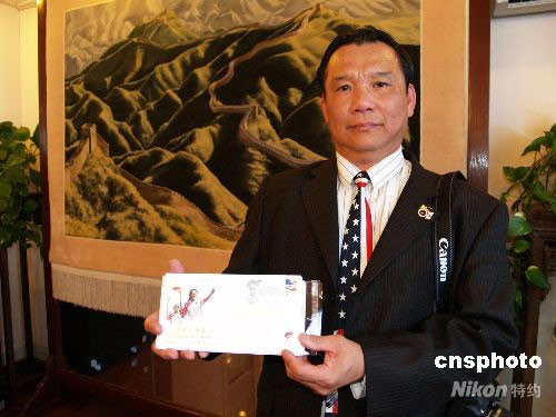4月13日,美国邮政局发行“2008年北京奥运圣火传递旧金山首日封”。这枚首日封由华人设计师魏进发设计。中新社发 卢威 摄