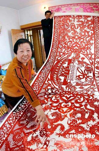 4月14日,由沈阳市民王玉芬创作的《百龙迎奥运》巨幅剪纸作品亮相沈阳,这幅剪纸作品长11米,高1.2米,由王玉芬耗时两年时间创作完成,整幅作品由100条形态各异的龙与奥运标识组成,表达龙的子孙遥祝北京奥运会的成功举办。 中新社发 罗澜 摄