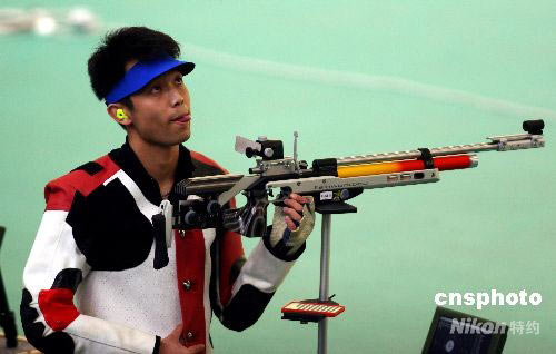 4月14日,“好运北京”国际射联世界杯进入第三日,神奇小子朱启南在男子10米气步枪决赛中上演一幕精彩绝伦的惊天逆转,最终以700.8环,领先美国名将埃蒙斯(Matthew EMMONS)0.1环的微弱优势,惊险为中国队夺得本次世界杯赛首金。中新社发 富田 摄