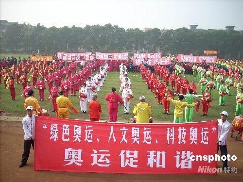 4月15日,四川彭山县开展“迎奥运千人健步行”活动,1300多名老年健身爱好者汇聚一堂,以健步走2008步的独特方式迎接即将到来的北京奥运会。中新社发 尧遥 摄
