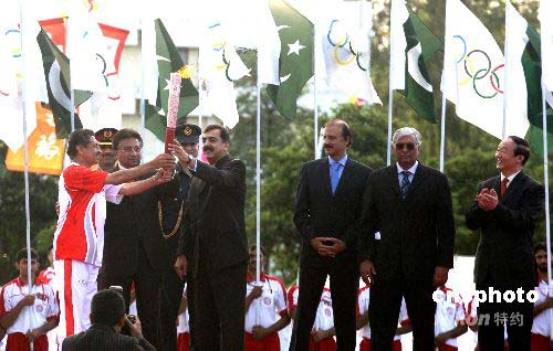 4月16日下午5时,巴基斯坦曲棍球队前队长义夫拉·汗从巴基斯坦总统穆沙拉夫和总理吉拉尼两人手中接过第一棒“祥云”火炬,北京奥运圣火开始在巴基斯坦首都伊斯兰堡传递。图为巴基斯坦总统穆沙拉夫(左三)、总理吉拉尼(左五)与义夫拉·(左一)三人共举火炬。作者: 沈晨