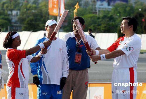 4月16日下午5时,巴基斯坦曲棍球队前队长义夫拉·汗从巴基斯坦总统穆沙拉夫和总理吉拉尼两人手中接过第一棒“祥云”火炬,北京奥运圣火开始在巴基斯坦首都伊斯兰堡传递。图为中国驻巴基斯坦大使罗照辉(右)与第三棒火炬手交接。作者: 沈晨