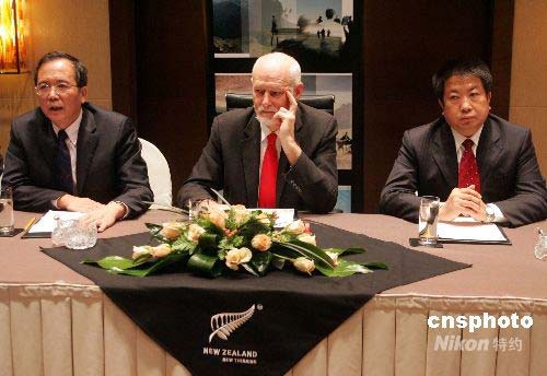 4月17日,在北京访问的新西兰科技部部长Pete Hodgson(中)出席新闻发布会,宣布新西兰梅西大学和中国的北京大学、石河子大学三所高校,将联合开展“绵羊非季节性产羔特性的基因标记研究”项目。图为发布会现场。中新社发 张宇 摄