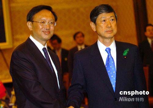 4月17日,中国外长杨洁篪抵达东京,与日本外相高村正彦商谈胡锦涛主席下月访日的具体事宜。高村正彦表示,日方期盼胡锦涛主席访日取得圆满成功。中新社发 朱沿华 摄