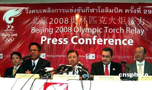 4月17日,泰国奥委会在国家体育馆就奥运火炬传递活动举行新闻发布会。泰国奥委会主席育塔萨先生(中)表示,曼谷为迎接北京奥运会圣火已经做好一切准备。曼谷的火炬传递活动将在当地时间19日下午三点开始。火炬将从曼谷唐人街——耀华叻路起跑,途经富有泰国民族文化特色的地点,如大王宫、王家田广场、民主纪念碑、五世王纪念广场等,全程约10公里。 作者: 顾时宏