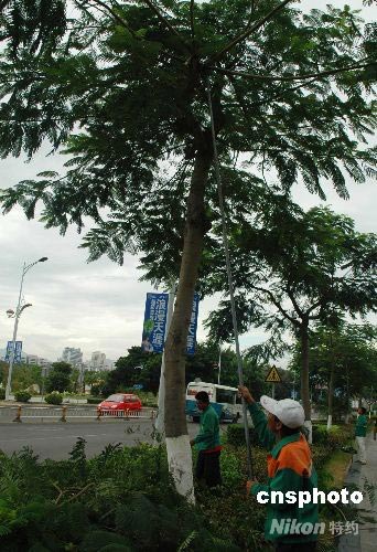 4月18日,海南三亚的园林工人在街道上修剪树枝备战台风“浣熊”。中新社发 尹海明 摄