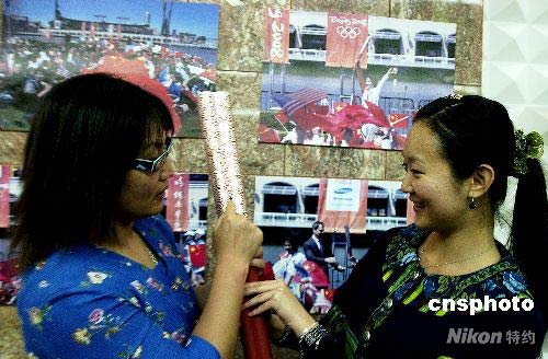 首棒火炬手、前奥运游泳冠军林莉(左)介绍祥云火炬的构造。 陈钢 摄