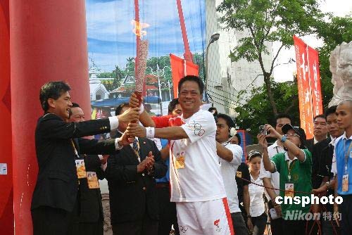 4月19日下午3时15分,祖籍中国海南的泰国第二代华裔阿南·诗里帕差腊蓬从曼谷市市长阿皮拉手中接过“祥云”火炬,北京奥运圣火在此间的传递正式开始。北京奥运圣火在曼谷的传递约10.8公里,共有80名火炬手,其中泰籍华人占一半以上。火炬自唐人街中华门出发后,途经卧佛寺、大王宫、民主纪念碑、集拉达王宫、阿南达王宫等曼谷著名景点后,最终在五世王铜像广场举行庆典仪式。图为阿南·诗里帕差腊蓬(右)从曼谷市市长阿皮拉手中接过“祥云”火炬。 中新社发 沈晨 摄