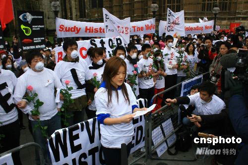 当地时间19日,在英国学习、工作和定居的华人约2000多人在伦敦举行静默集会,抗议包括英国广播公司(BBC)在内的西方媒体对中国所做的不公正的、片面的报道。图为集会组织者秦辰在宣读抗议声明。中新社发 李鹏 摄