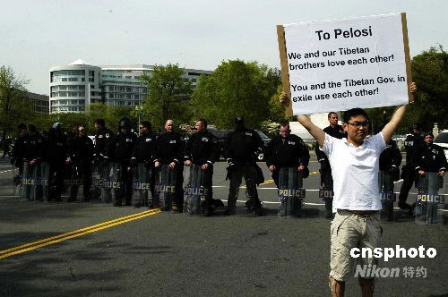 当地时间4月19日,近千名中国留学生和当地的华侨华人在美国国会山前举行示威活动,支持北京奥运,反对CNN丑化中国人的评论。图为一名留学马里兰大学攻读机械工程博士的中国学生独自一人举着抗议佩洛西的牌子,在众多警察人墙外示威。 中新社发 邱江波 摄