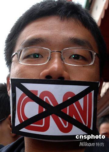 当地时间4月19日上午,洛杉矶当天爆发十几年来最大规模的华人华侨抗议示威活动。数千名华人华侨和留学生在CNN洛杉矶分部门前参加和平示威,要求CNN向公开郑重道歉,并开除卡弗蒂。图为一名抗议者戴着抗议CNN的口罩参加示威活动。中新社发 张炜 摄