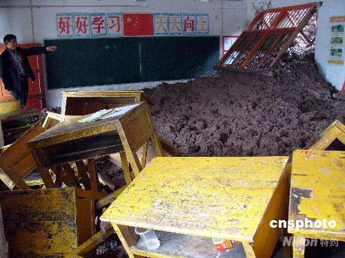 4月21日,湖北省兴山县小河村甘家坡特大山体滑坡现场。4月18日上午至20日凌晨,湖北兴山县出现持续暴雨天气,最高降雨量达106毫米。19日下午5时30分,兴山县高阳镇小河村甘家坡开始发生特大山体滑坡,截至20日10时,滑坡体体积达6万立方米,形成2万立方米泥石流。该滑坡体位于高阳镇中心小学背后,泥石流冲垮学校后围墙40米,推倒学生食堂1栋3间,涌入了1楼教室并蔓延至操场。幸亏事发时学生逢周末放假不在校,否则可能会导致群死群伤的灾难性后果。目前,又有2万立方米滑坡体已经变形,存在继续下滑的可能,受特大滑坡及泥石流险情直接危及的高阳镇中心小学已从21日起停课,甘家坡周边37户179人已撤出现场。中新社发 刘君凤 摄