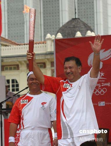 图为第一棒火炬手、马来西亚奥委会主席东姑伊姆拉展示“祥云”火炬。作者: 沈晨
