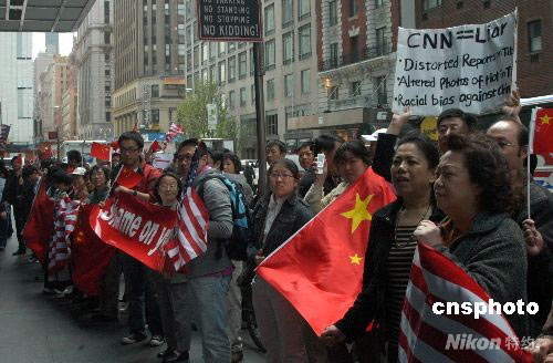 数百华侨华人及中国留学生二十一日在美国有限电视新闻网(CNN)驻纽约办公大楼前游行,强烈抗议CNN辱华报道。中新社发 李静 摄