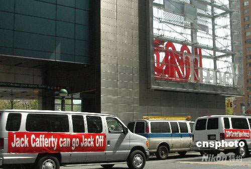 纽约华人社团二十一日租用多辆巴士,悬挂抗议CNN口号的标语,围绕美国有限电视新闻网(CNN)驻纽约办公大楼周围行驶,强烈抗议CNN辱华报道。中新社发 李静 摄