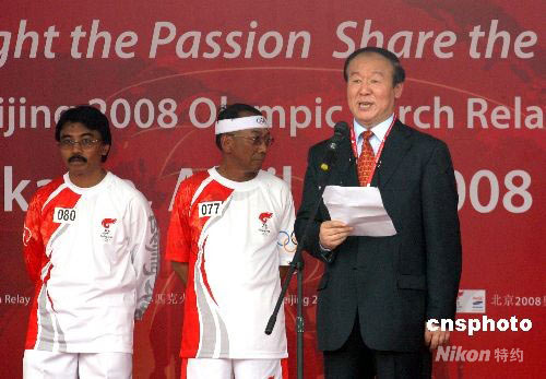 4月22日下午3时30分,印尼青体部部长阿迪亚克萨·道尔特用手中的“祥云”火炬点燃圣火盆,北京奥运圣火在雅加达的传递顺利结束。北京奥运圣火雅加达站传递从苏加诺体育中心东门开始后,八十名火炬手围绕其中的苏加诺体育场进行七公里左右的传递。八十位火炬手中,有印尼现役和退役优秀运动员、赞助商代表、政府官员、社会活动家等。21日晚10时,北京奥运圣火将离开雅加达,前往下一站——澳大利亚的堪培拉。图为北京奥组委执行副主席蒋效愚(右)在庆典仪式上致辞。中新社发 沈晨 摄