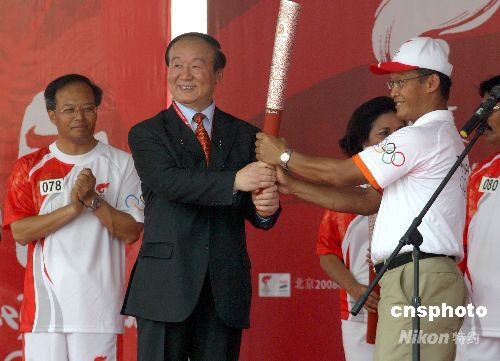图为北京奥组委执行副主席蒋效愚(左二)向雅加达省政府赠送“祥云”火炬。 沈晨 摄