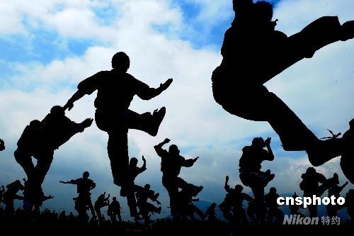 4月下旬,河南登封塔沟武校的练武少年在勤练武功。在闻名海内外的河南省登封市少林寺周围,每天都有数万人在习武,练武林中的绝活,他们用精湛武艺展示飞檐走壁、童子功、气功等。中新社发 高山岳 摄