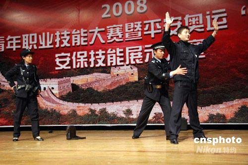 以“迎奥运、比技能、促振兴”为主题的2008沈阳青年职业大赛开幕式暨奥运安保技能展示大赛4月24日在沈阳举行。这次大赛充分展示沈阳市公安民警关注奥运、参与奥运、奉献奥运的精神风貌,通过比赛将全面提升奥运安保人员的综合素质、执法能力和实战能力,打造一支高效率、高水平、符合奥运规则、体现国际水平的安保服务队伍,确保沈阳赛区足球比赛顺利进行。中新社发 赵敬东 摄