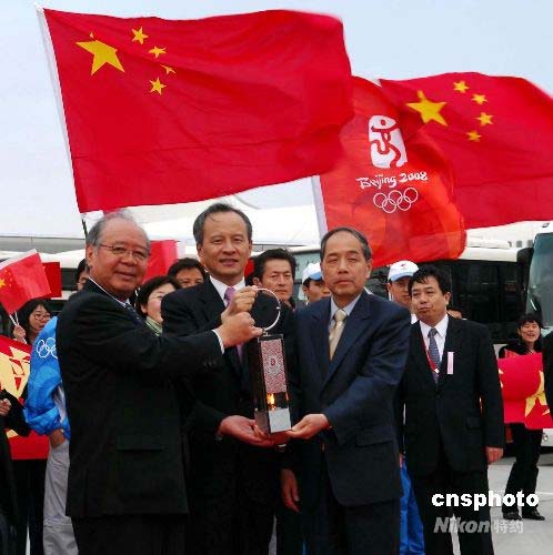中国驻日大使崔天凯(中)到机场迎接奥运圣火抵达日本。