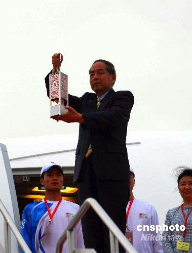 北京奥运会组织委员会副主席李炳华先生持北京奥运火种走出专机。中新社发 侯宇 摄
