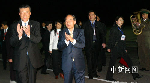 4月28日凌晨0时20分,载有北京奥运圣火的“奥运圣火号”平稳地降落在平壤国际机场。朝鲜首都平壤是北京奥运圣火海外传递“和谐之旅”的第18站。这是奥运圣火自一九三六年开始传递活动以来,首次来到朝鲜。图为北京奥组委执行副主席李炳华(左二)与中国驻朝鲜大使刘晓明(左)在机场受到热烈欢迎。沈晨 摄