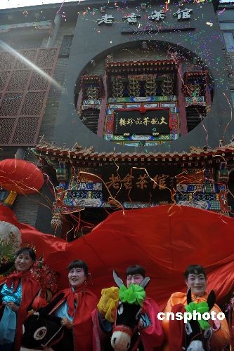 4月27日,为了迎接奥运宾朋重装一新的北京老舍茶馆重新开张。当日,老舍茶馆举办第五届茶文化节。据了解,近期北京众多餐饮等第三产业商户重装改造迎接北京奥运所带来的消费热潮。 中新社发 廖攀 摄