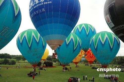 四月二十八日,海口热气球节,来自全国的四十支热气球队搅热椰城,近千名市民争乘热气球体验升空感受。中新社发 王辛莉 摄