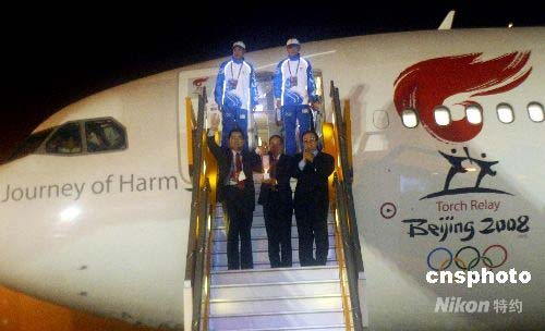 4月28日晚10时57分,载着北京奥运圣火的“奥运圣火号”抵达“和谐之旅”海外传递第十九站——越南的胡志明市。北京奥运圣火在胡志明市的传递将于29日晚6时开始,从位于该市中心的大剧院出发,经过多处著名地标后,抵达设在终点第七军区体育馆,全程长约十多公里。图为北京奥组委执行副主席李炳华(中)手持圣火灯走下飞机。 中新社发 沈晨 摄