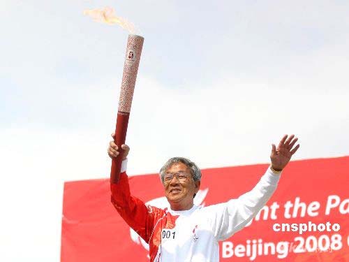 4月28日上午10时许,北京奥运圣火在朝鲜首都平壤开始传递。北京奥运圣火在平壤的传递,从主题思想塔出发,途径中朝友谊塔、千里马雕像、凯旋门等主要景点,最终在金日成体育场举行庆典仪式。图为第一棒火炬手朴斗翼高举火炬。 中新社发 沈晨 摄