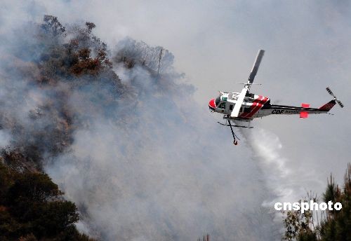 当地时间四月二十八日,消防直升机正在向着火区域撒下阻燃剂。中新社发 张炜 摄