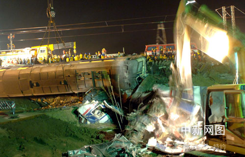 4月28日深夜,“4·28”胶济铁路事故现场加紧清理。当地铁路部门、武警部队等上万名抢险人员在将伤员和旅客转移后,对铁路轨道和供电线路进行紧急抢修,并同时清理被撞毁列车车厢。邹宪 摄