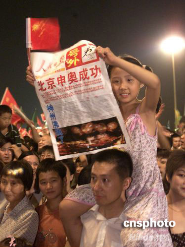2001年7月13日夜,北京天安门广场聚集数十万民众,庆祝北京申奥成功。毛建军 摄