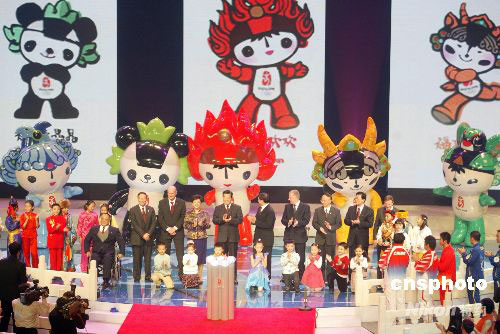 2005年11月11日晚,北京二零零八年奥运会吉祥物发布暨倒计时一千天活动在北京工人体育馆举行,五个吉祥物福娃贝贝、福娃晶晶、福娃欢欢、福娃迎迎、福娃妮妮隆重登场。作者:盛佳鹏
